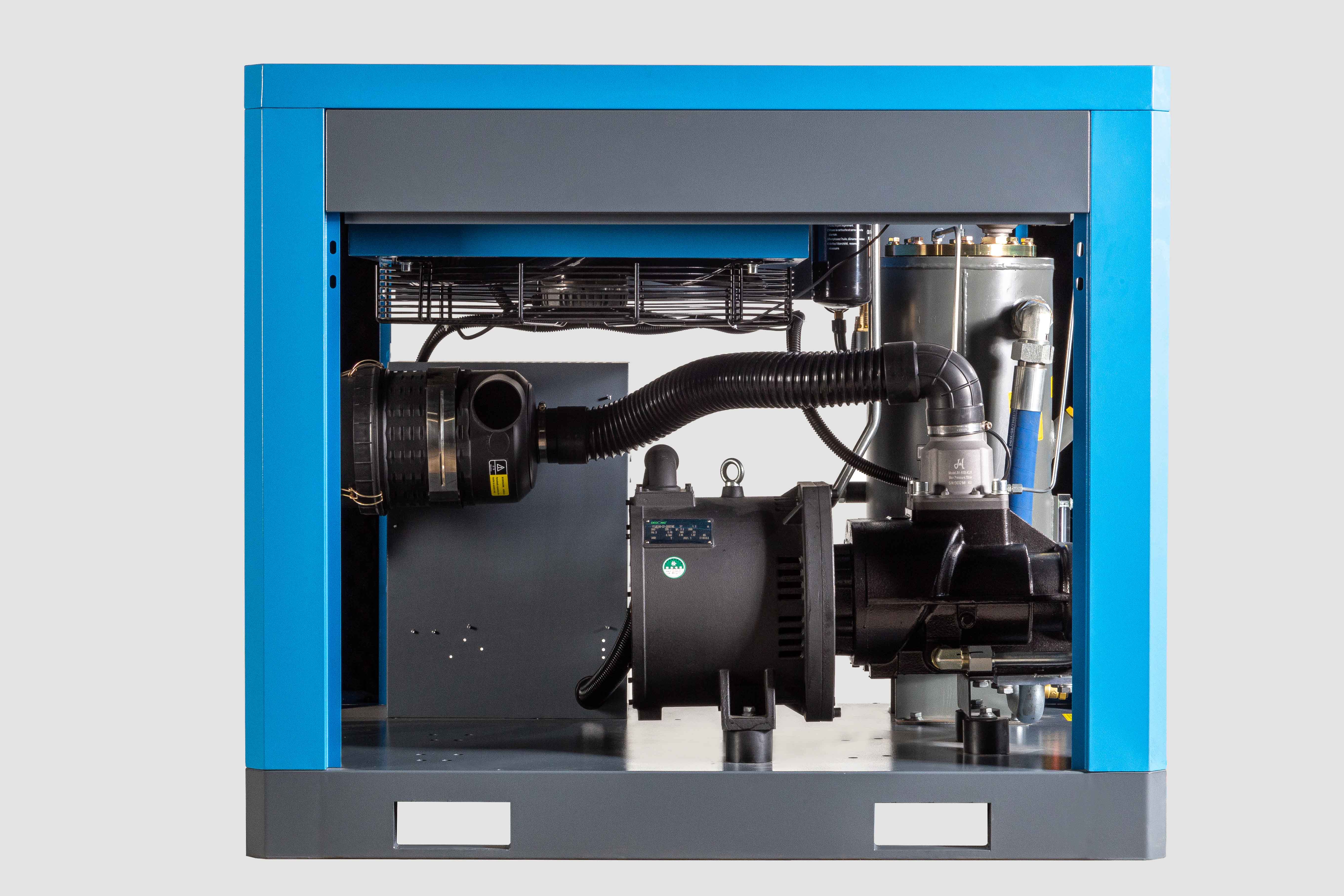 单级永磁变频系列,选用高效双螺杆主机、高效永磁一体电机、行业主流变频器,相比工频系列机型更节能